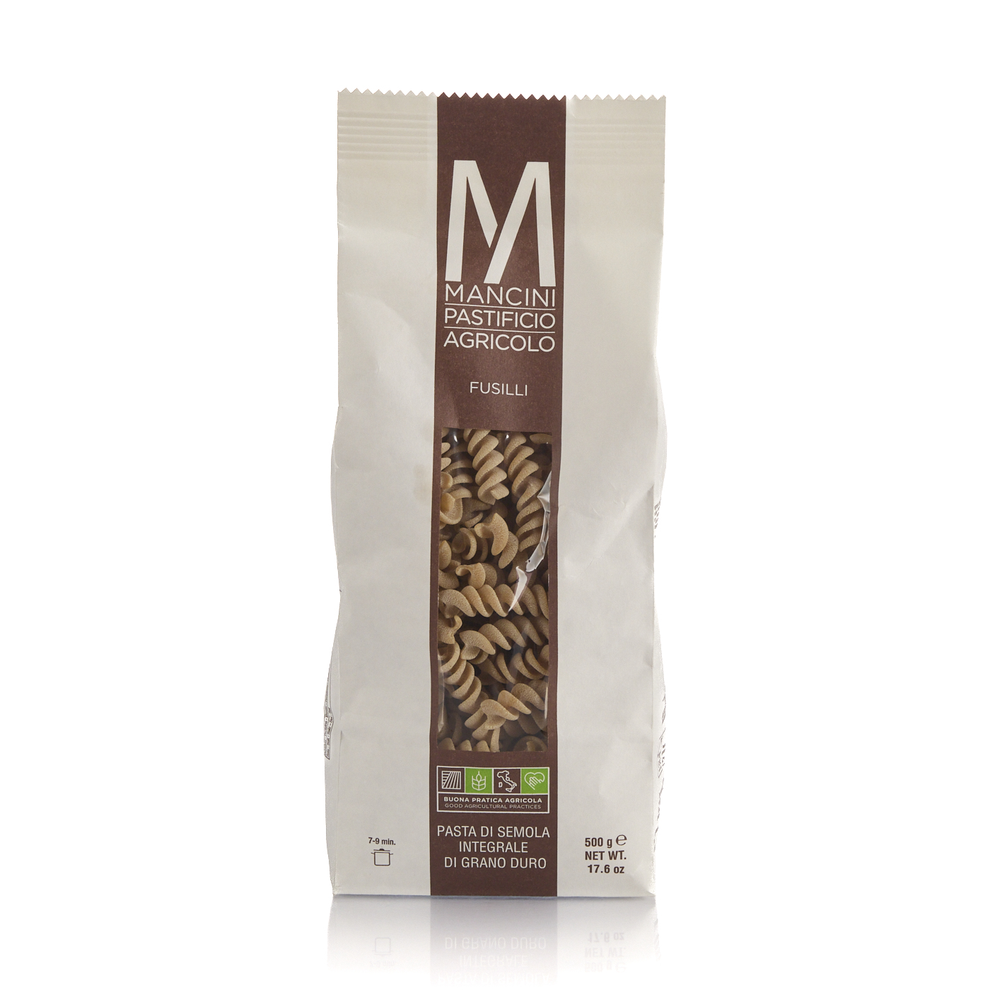 Die Vollkorn-Fusilli des Nudelfabrikanten Pasta Mancini aus den Marken bestehen ausschließlich aus Zutaten, die aus biologischem Anbau stammen - das macht die Pasta nicht nur besonders lecker, sondern zugleich gesund! Koche die Nudeln für 8 bis 10 Minuten und genieße sie anschließend mit etwas Tomatensoße und fein geriebenem Parmesan!