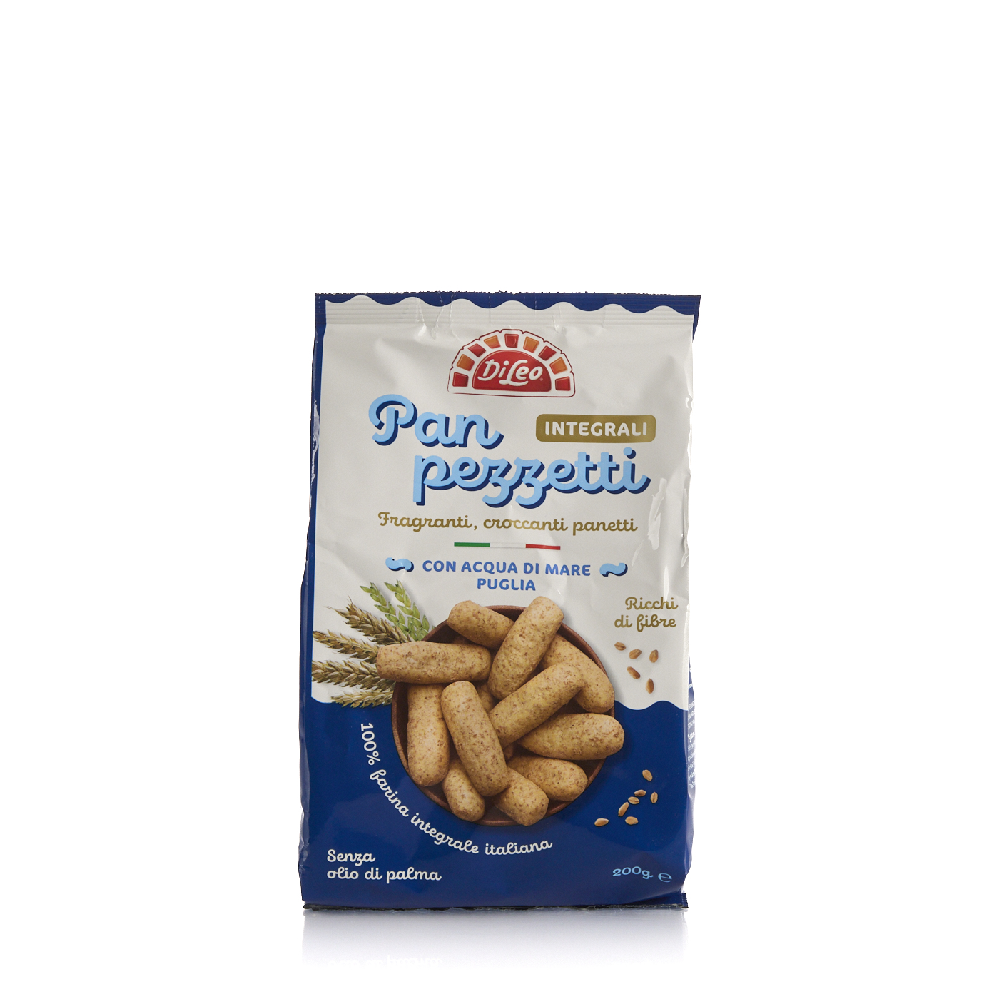 Pan Vollkornstückchen, Di Leo. Eine Zubereitung, die gereinigtes Meerwasser mit natürlichen Zutaten vereint und ein knuspriges und duftendes Produkt bietet.