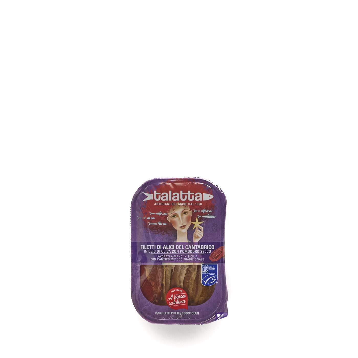**Anchovy fillets with sun-dried tomatoes in olive oil**, Talatta. A preparation that combines the quality of fish from the Cantabrian Sea with Italian expertise in processing.