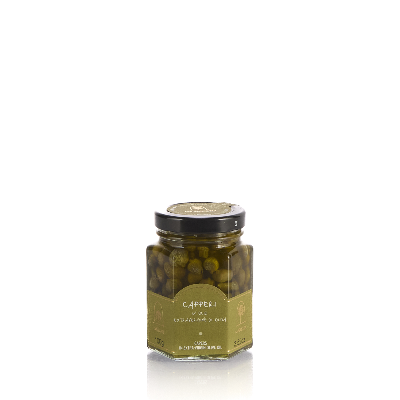 Capers in Extra Virgin Olive Oil, La Nicchia. A condiment that combines high-quality Italian capers with extra virgin olive oil, perfect for enhancing your dishes with a Mediterranean touch.