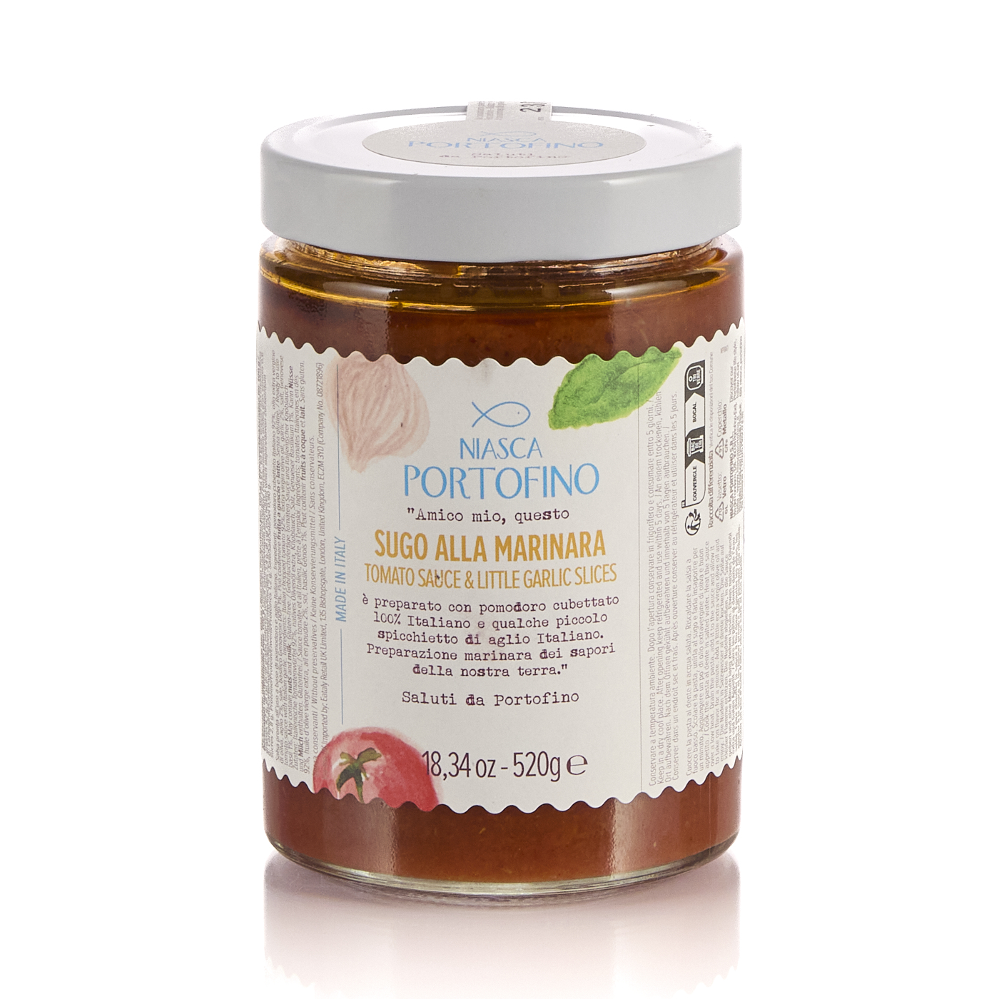 Marinara Sauce, Niasca Portofino. A preparation that evokes the authentic flavors of Mediterranean tradition, made with 100% Italian diced tomatoes and small cloves of Italian garlic.