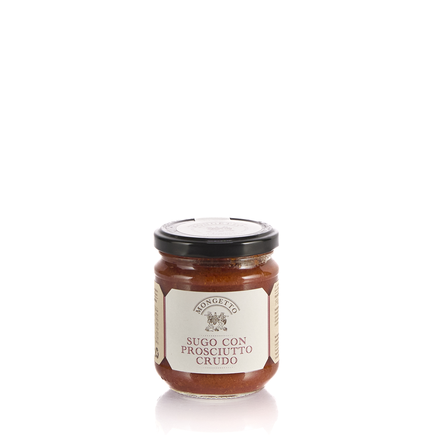 Raw Ham Sauce, Il Mongetto. A condiment that combines the quality of carefully selected Italian tomatoes with the unique flavor of raw ham, perfect for enhancing your pasta dishes.