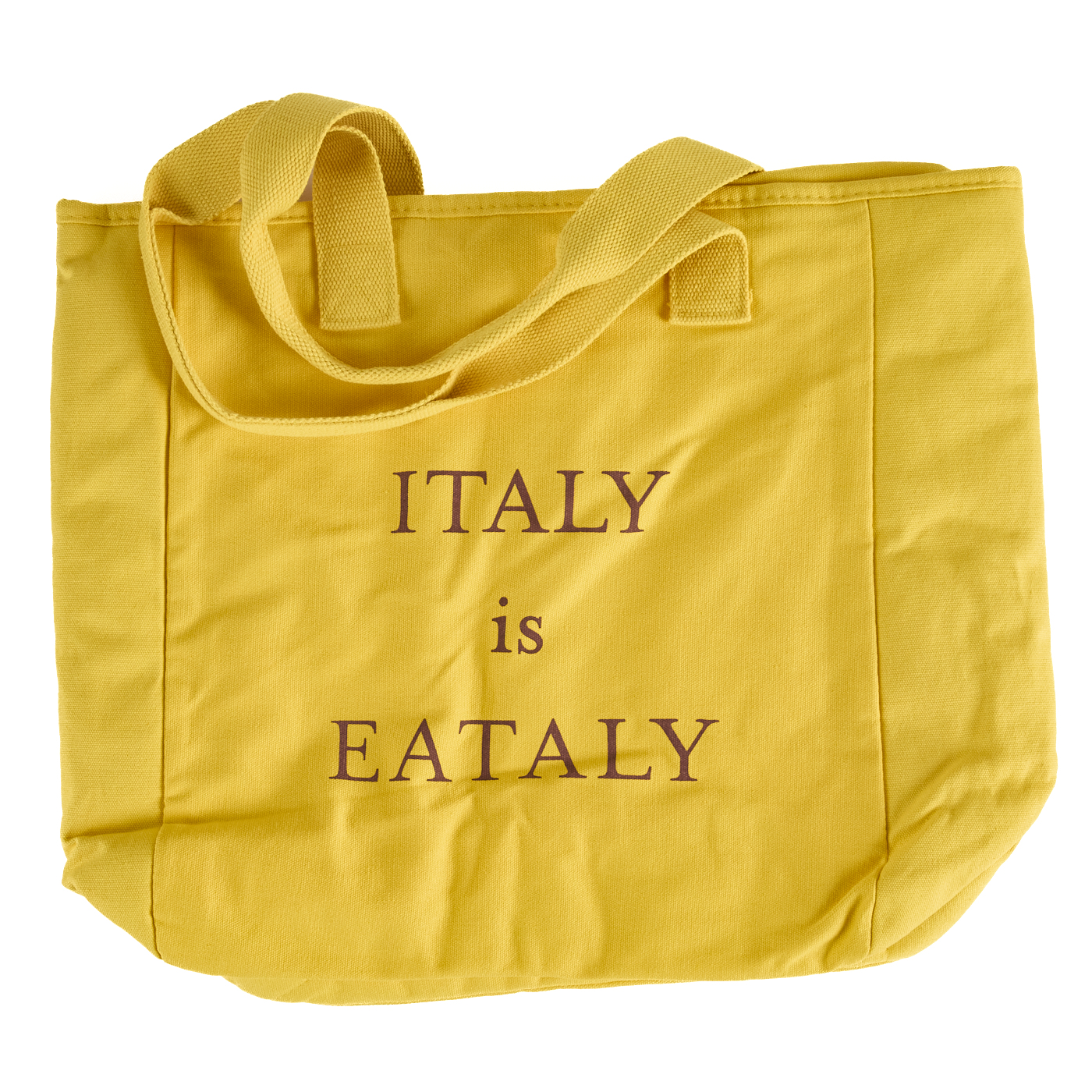 Yellow canvas bag, Eataly. A practical accessory with Italian design, featuring the brown inscription 'ITALY is EATALY' that enhances its unique style.