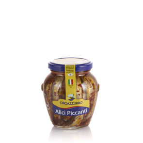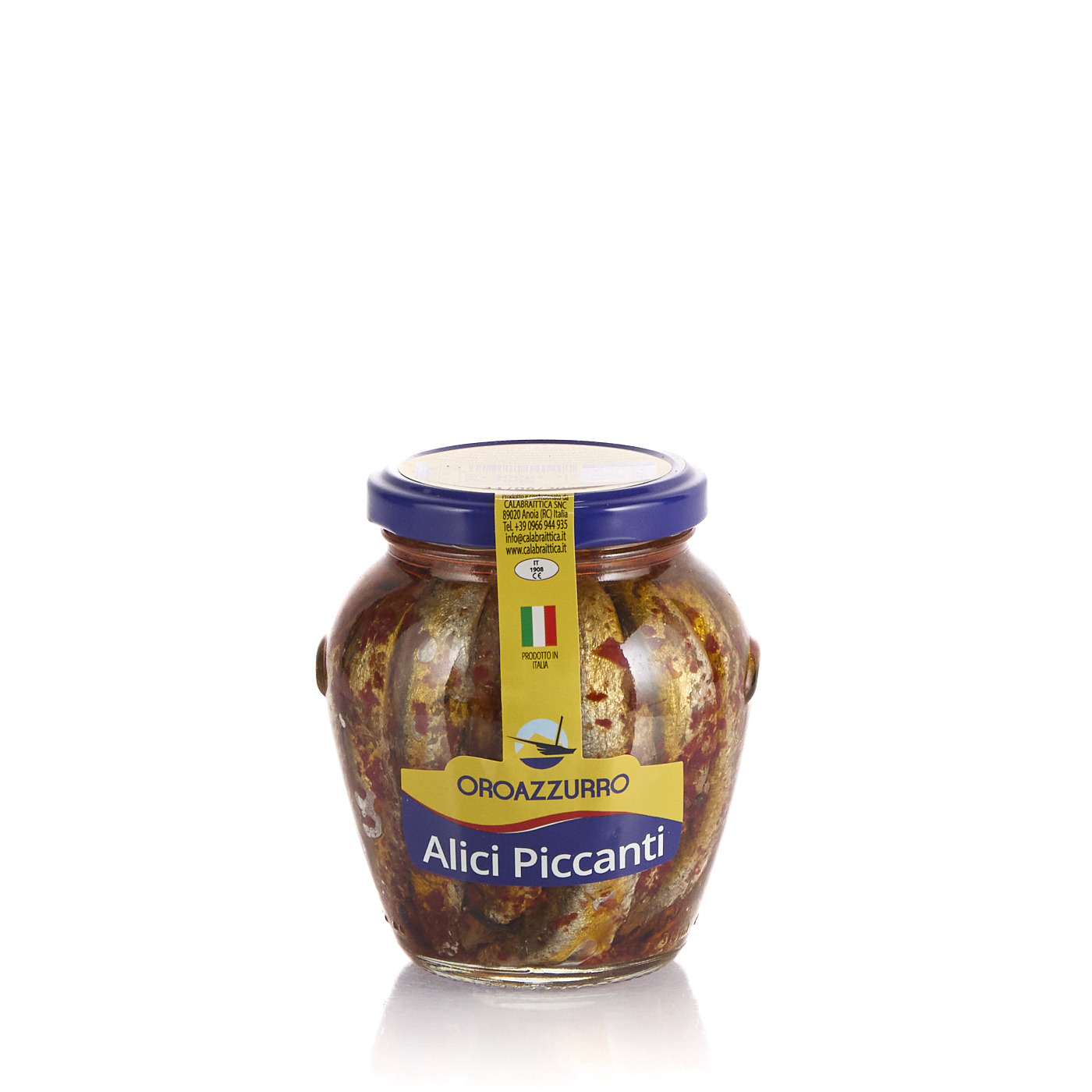 Alici salate con olio di semi di girasole e peperoncino, Oroazzurro. Un prodotto italiano che combina l'autenticità delle alici salate con il sapore intenso del peperoncino, donando un tocco di gusto mediterraneo.