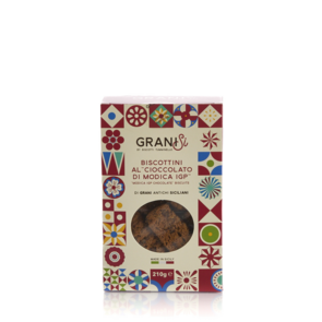 Biscottini al cioccolato di Modica IGP, Tumminello. Una creazione che celebra l'eccellenza dei grani antichi siciliani e del Cioccolato di Modica IGP fondente, per un connubio di sapori autentici.