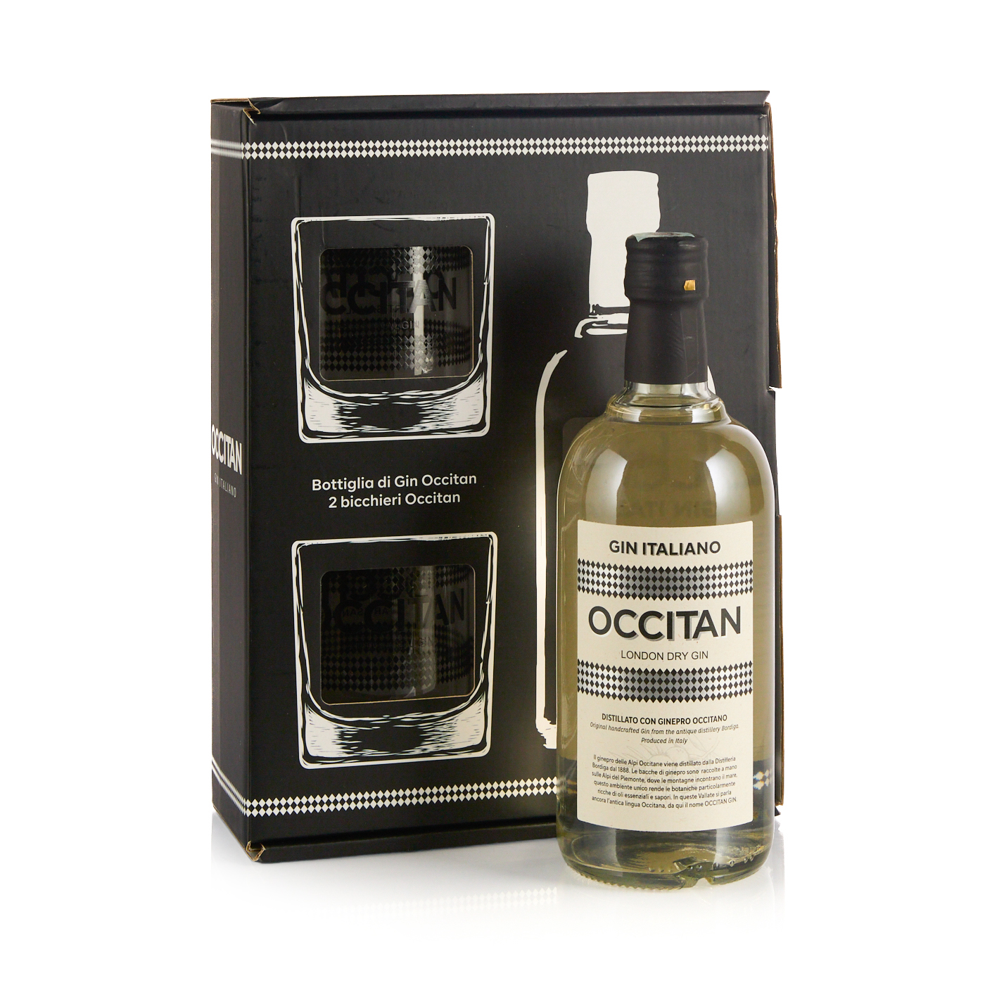 Bottigilia di Gin Occitan e 2 bicchieri, Bordiga. Un distillato che celebra la tradizione della storica Distilleria Bordiga, attiva dal 1888, utilizzando bacche di ginepro raccolte a mano nelle Alpi Occitane.