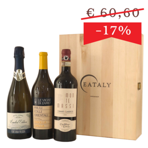 Per contenere al meglio le tre bottiglie e rendere il regalo ancor più elegante una cassetta di legno, per un dono sicuramente apprezzato.