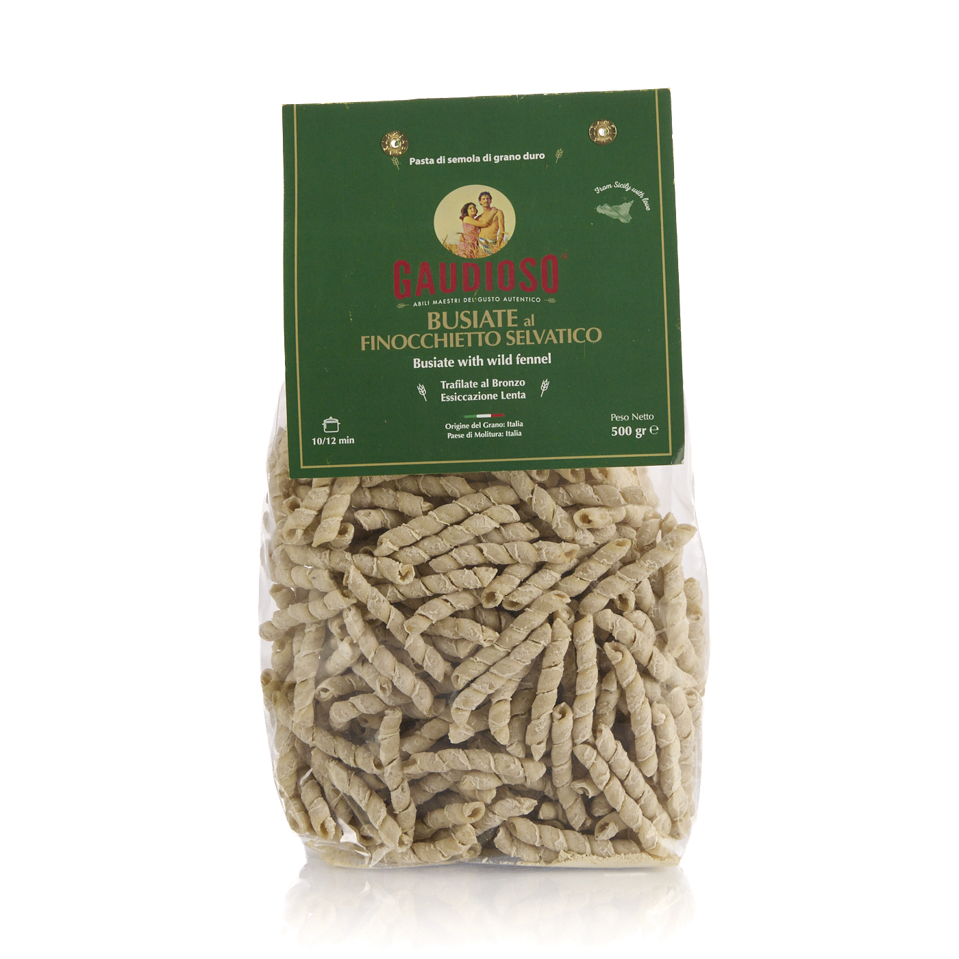 Busiate con finocchietto selvatico, Gaudioso. Una pasta trafilata al bronzo che combina la semola di grano duro italiano con il finocchietto selvatico essiccato, per un sapore unico e autentico.