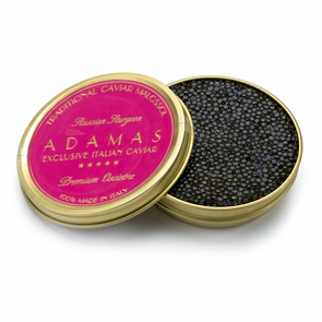 Caviale Pink Label di Adamas: un caviale pregiato e fresco, ottenuto tramite un metodo di lavorazione tradizionale e accurato.