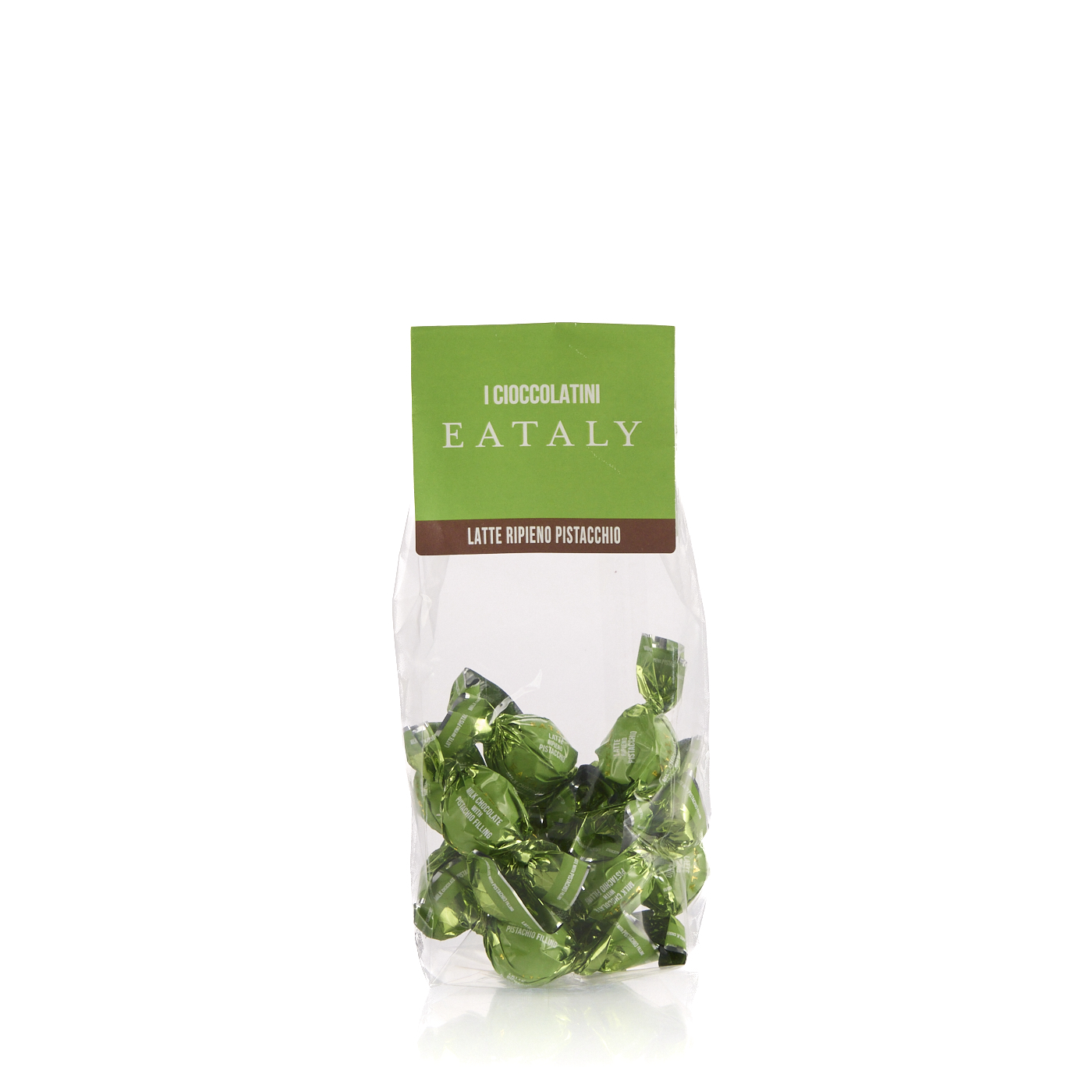 Cioccolatini al latte con ripieno di crema al pistacchio, Eataly. Deliziose praline di cioccolato al latte extra, arricchite da un morbido ripieno al pistacchio, per un'esperienza di gusto unica.
