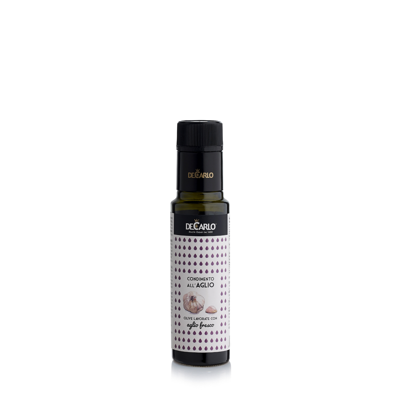 De Carlo propone uno sfizioso e saporito elisir all'aglio, ricco di profumo e sapore, perfetto per arricchire svariati piatti e preparazioni. Le olive vengono infatti lavorate direttamente con l'aglio fresco, per creare un prodotto di alta qualità, molto lontano dal solito olio aromatizzato.