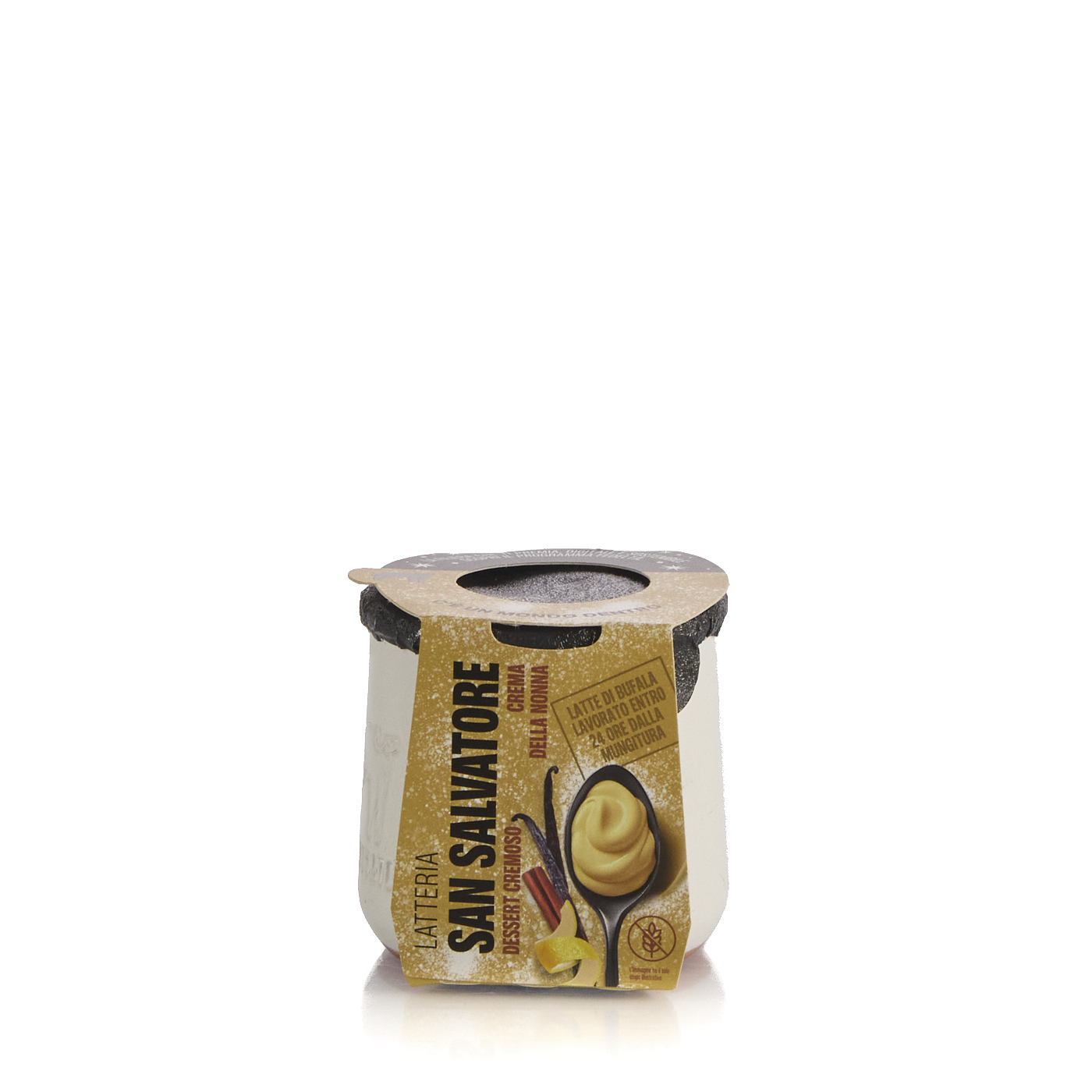 Crema di bufala al limone e vaniglia, San Salvatore. Una deliziosa preparazione a base di latte di bufala, arricchita con aromi naturali di limone e vaniglia, ispirata alla tradizione delle terre del Parco Nazionale del Cilento.