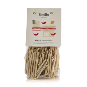 Fileja al peperoncino, Pastificio Fiorillo. Una pasta calabrese che combina la semola di grano duro con il carattere vivace del peperoncino, evocando i sapori autentici della tradizione regionale.