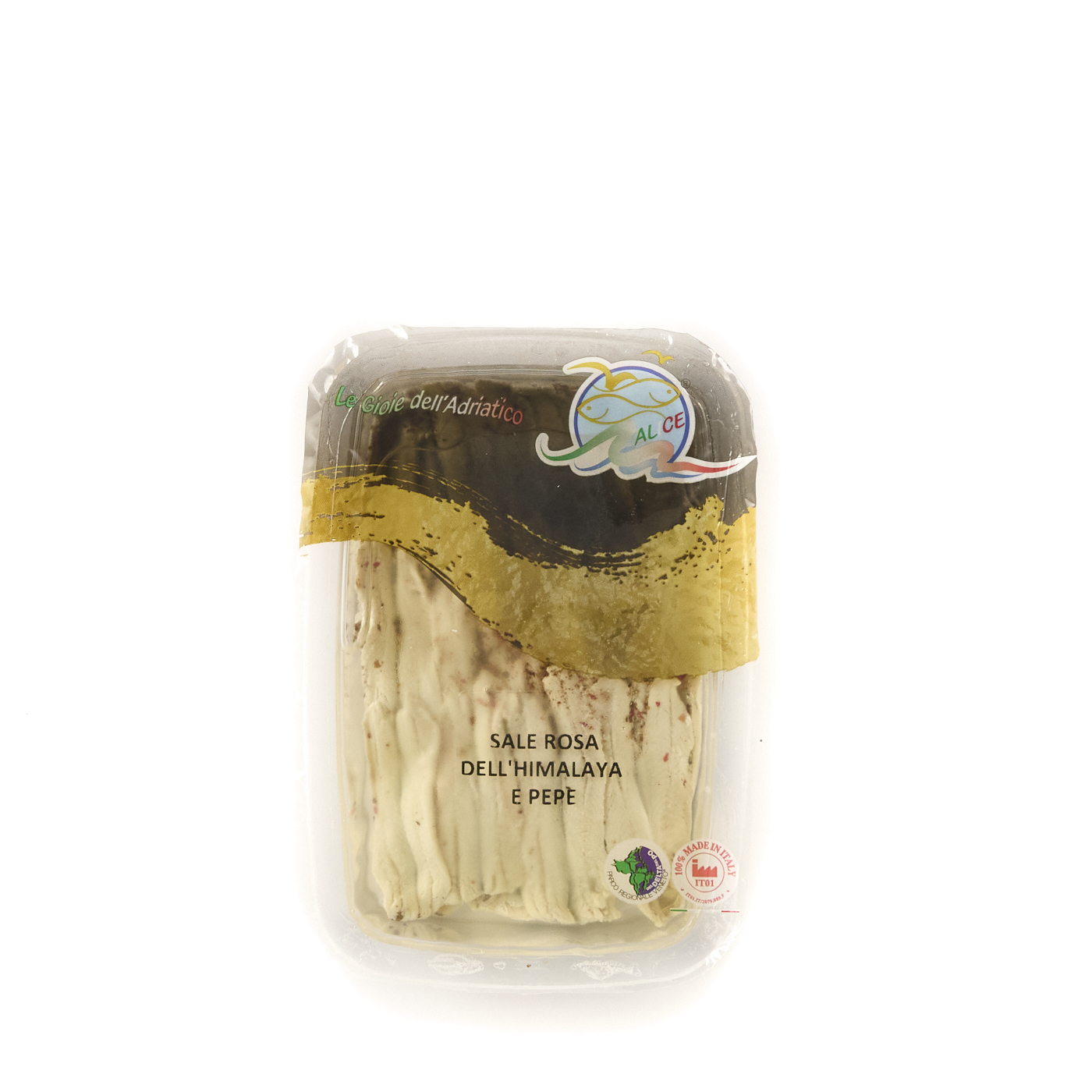 I filetti di alici sono marinati con ingredienti naturali, tra cui il pregiato sale rosa dell'Himalaya e una selezione di pepe nero e rosa, che conferiscono un gusto unico. La lavorazione segue metodi tradizionali, garantendo qualità e delicatezza.