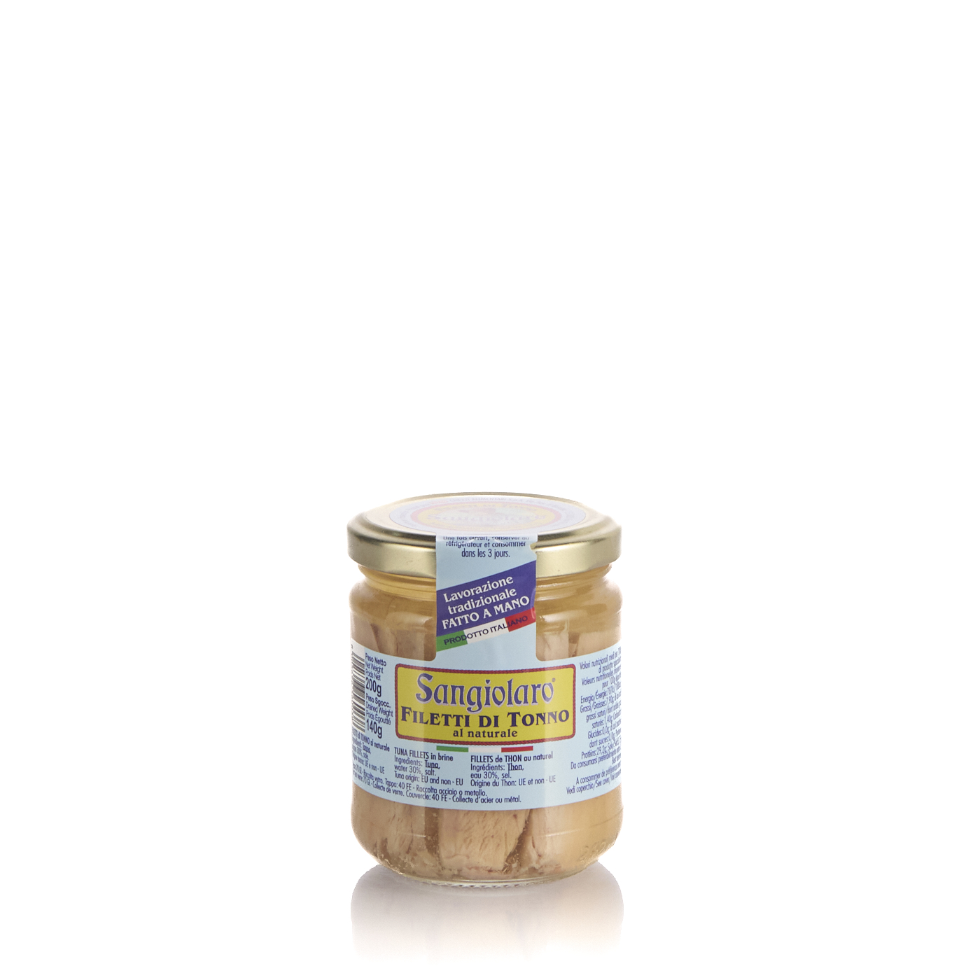 Filetti di tonno al naturale, Sangiolaro. Questo prodotto italiano di alta qualità è confezionato in un elegante vasetto di vetro trasparente e lavorato con metodi tradizionali e fatto a mano.