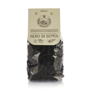 Fusilli al nero di seppia e germe di grano, Pastificio Morelli. Una pasta che combina il gusto unico del nero di seppia con la qualità del germe di grano, offrendo un'esperienza culinaria autentica e raffinata.