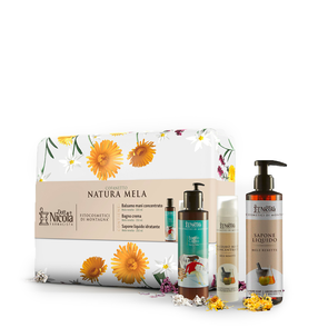 Gita in montagna: ecco il beauty box alla mela Renetta con i cosmetici del Dott. Nicola dal tocco retrò. Una selezione di prodotti per la cura del corpo all'inconfondibile fragranza della mela della Valle d'Aosta. Ideale per un regalo di Natale all'insegna del benessere.