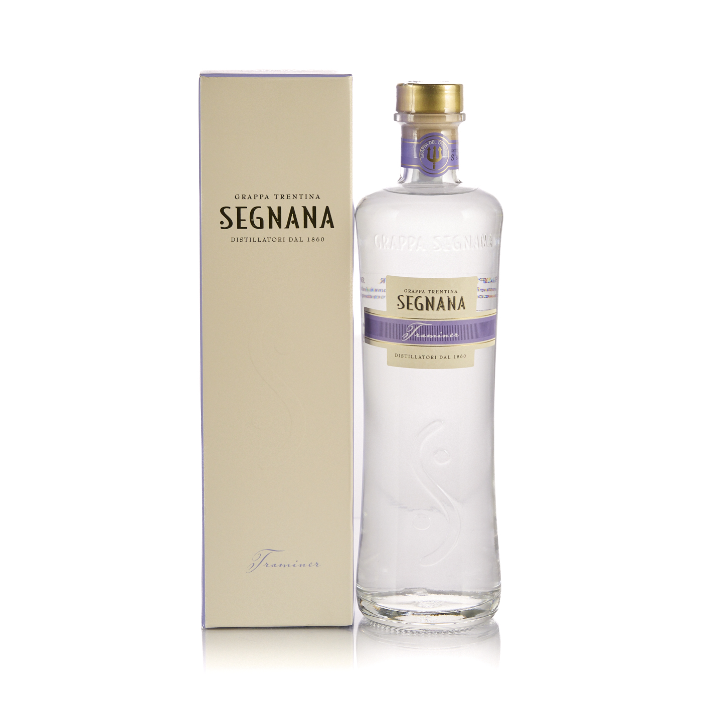 Grappa Traminer, Segnana. Questa grappa nasce dalla storica distilleria Segnana, rinomata per la sua esperienza nella distillazione e per l'uso di vinacce selezionate di Traminer.