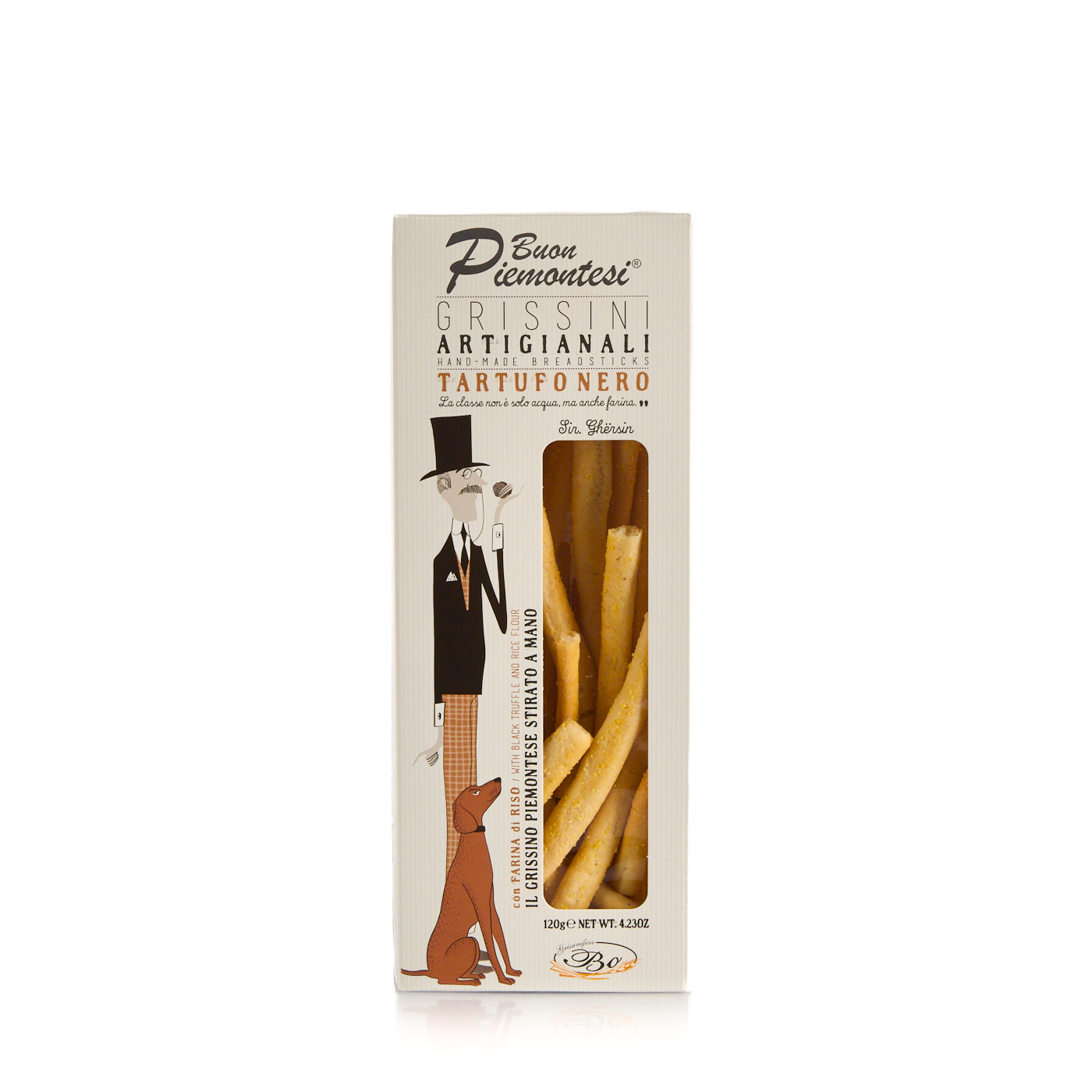 Grissini artigianali stirati a mano, senza strutto e con olio di riso ma arricchiti dall'inconfondibile sapore del tartufo nero. Friabili e leggeri, questi grissini sono ideali da gustare in ogni momento della giornata o da sgranocchiare come snack.
