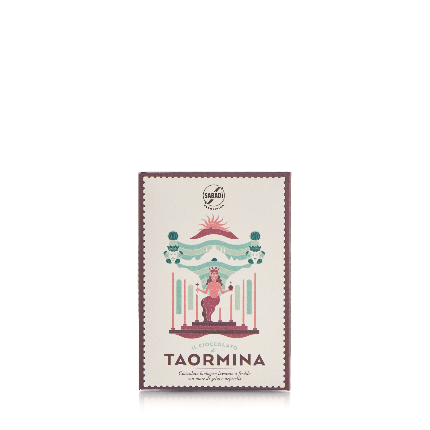 Il cioccolato di Taormina, Sabadi. Una prelibatezza realizzata con cacao lavorato con sapienza artigianale, abbinato alla freschezza della nepetella e alla dolcezza delle more di gelso, provenienti da coltivazioni biologiche in Sicilia.