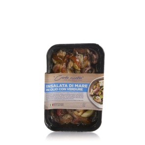 Insalata di mare in olio con verdure, Poliartigiana. Una preparazione gastronomica cotta che esalta il sapore del pesce, lavorato con cura e arricchito da ingredienti selezionati.