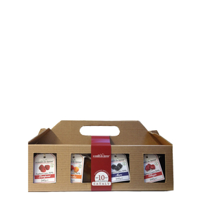 Il kit contiene una confettura di lamponi, una di pesche, una di more e una di ciliegie. Tutte con un minimo del 70% di frutta.