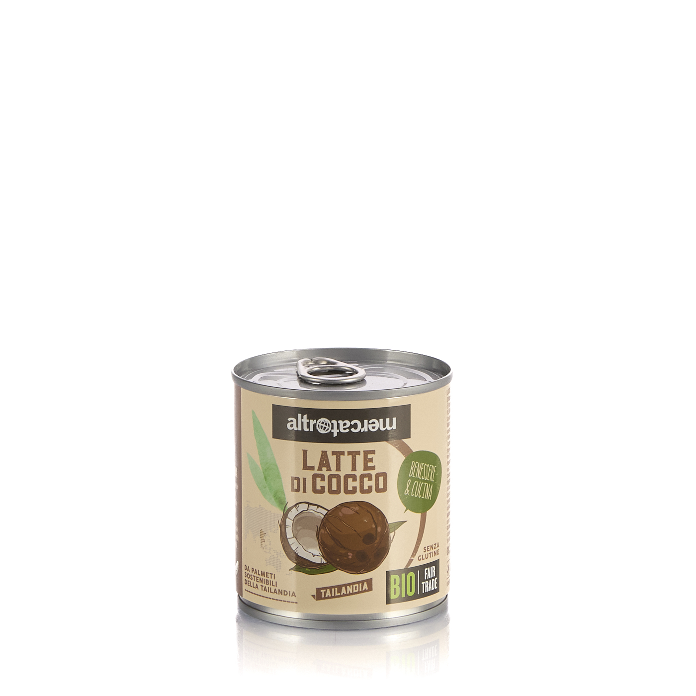 Latte di cocco biologico, Altromercato. Prodotto sostenibile ottenuto da palmeti coltivati in Thailandia e certificato fair trade.
