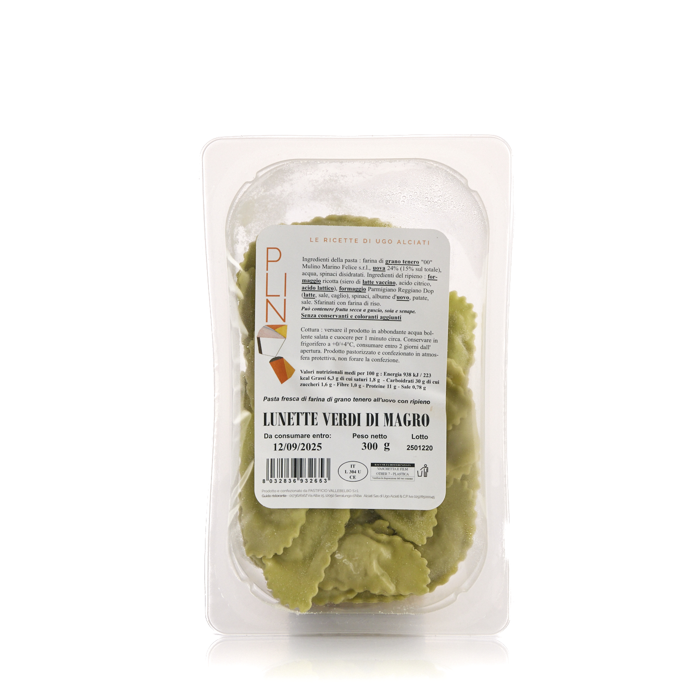 Lunette verdi di magro, Pastificio Vallebelbo. Pasta fresca all'uovo con ripieno di spinaci, ricotta e Parmigiano Reggiano DOP, preparata con cura per garantire un gusto autentico e una consistenza perfetta.