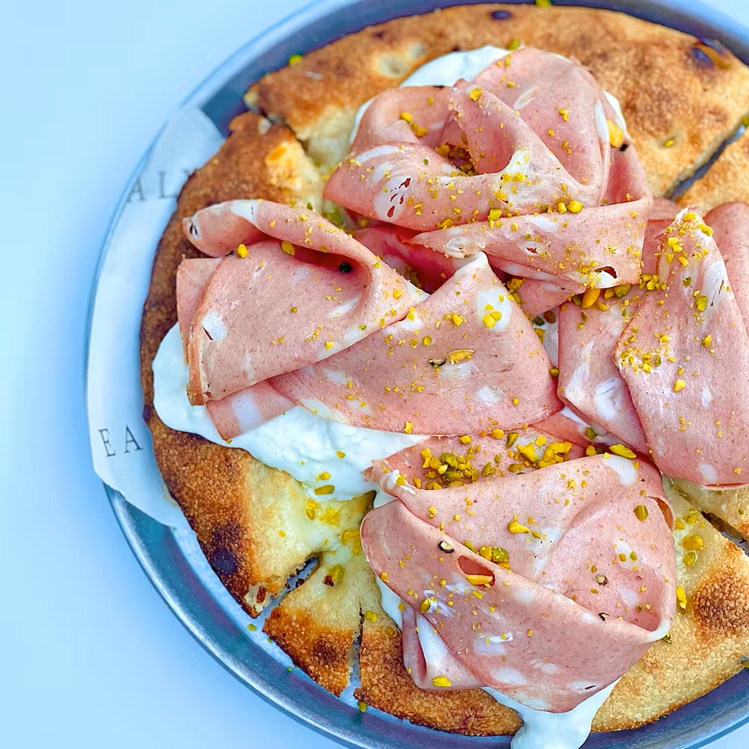 • Ricetta per pizza al padellino gourmet con mortadella, stracciatella e pistacchio