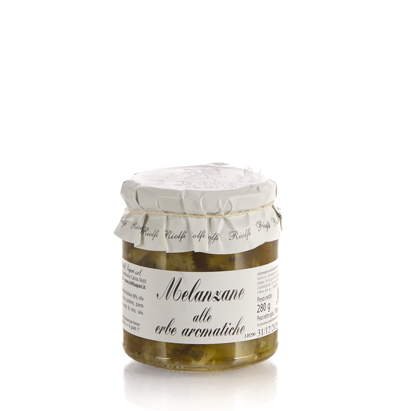 Melanzane italiane alle erbe aromatiche, Riolfi Sapori. Un prodotto che celebra l’intensità delle melanzane italiane e l’aromaticità delle erbe, offrendo un’esperienza autentica e naturale.