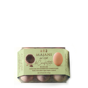 Ovette Confettate di Majani: sei gustosissime ovette di cioccolate fondente confettate in modo da renderle all'aspetto esattamente identiche alle uova, garantendo una dolcissima sorpresa a chi le assaggerà.