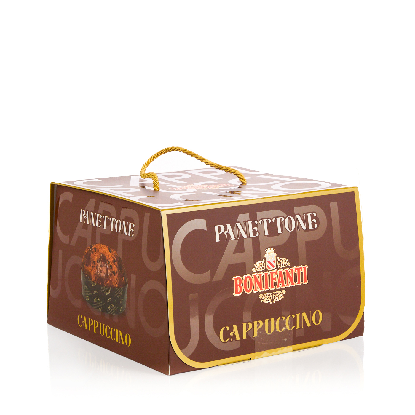 Panettone al cappuccino con gocce di cioccolato al latte e caffè, Bonifati. Un dolce pensato per chi ama i sapori intensi e avvolgenti, privo di uvetta e scorze di agrumi candite, ideale per arricchire i momenti di festa.