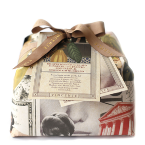 Panettone Ricoperto di Cioccolato Fondente Farcito con Crema al Cioccolato Modicano di Vincente: un panettone morbido e fragrante che rappresenta una vera e propria chicca golosa per deliziare il palato di chi ama i sapori più dolci e avvolgenti.