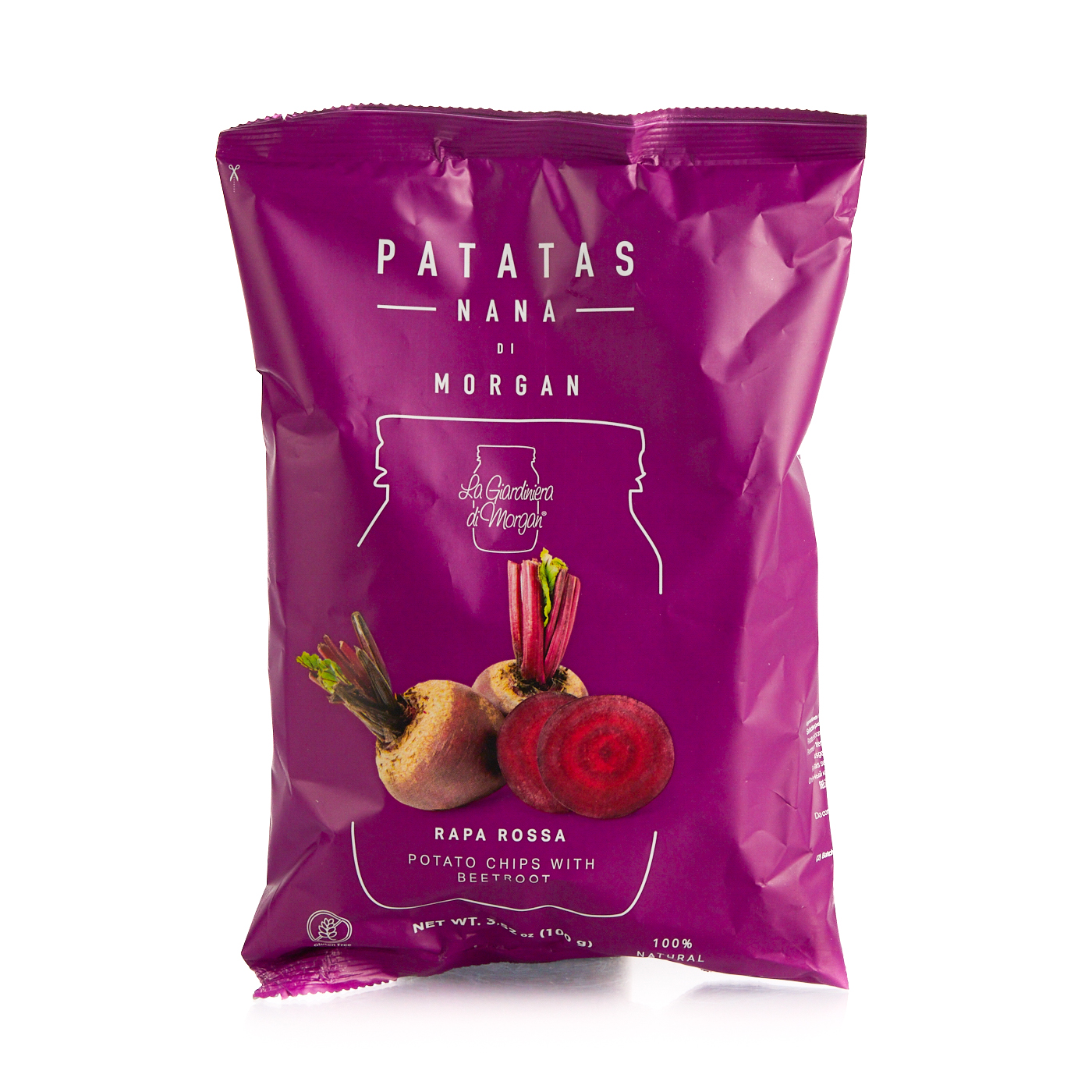 Patatine con polvere di rapa rossa, patatasnana. Uno snack che combina la croccantezza delle patate fritte con il gusto unico della rapa rossa disidratata, offrendo un'esperienza di sapore autentica e naturale.