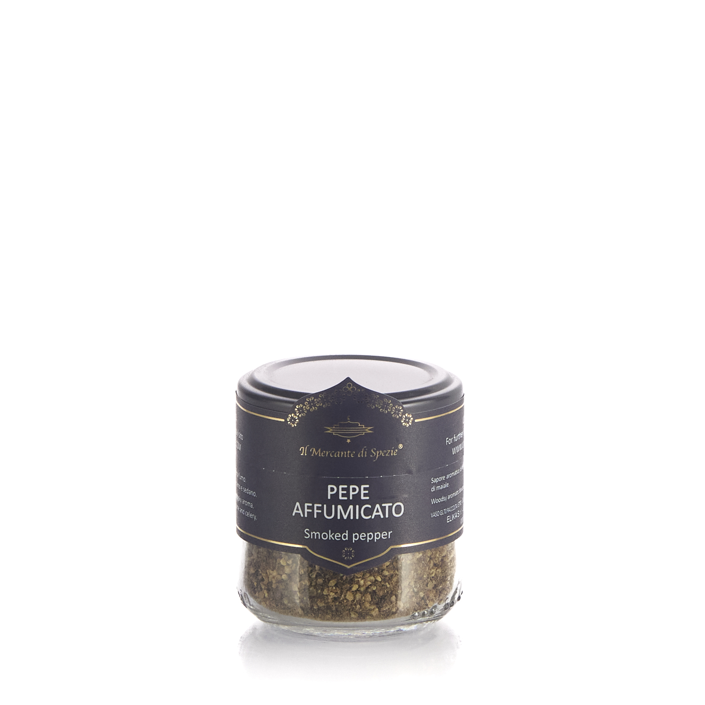 Pepe nero con aroma fumo, Il Mercante di Spezie. Un prodotto dall'aroma distintivo e intenso, perfetto per creare piatti dal carattere deciso e avvolgente.