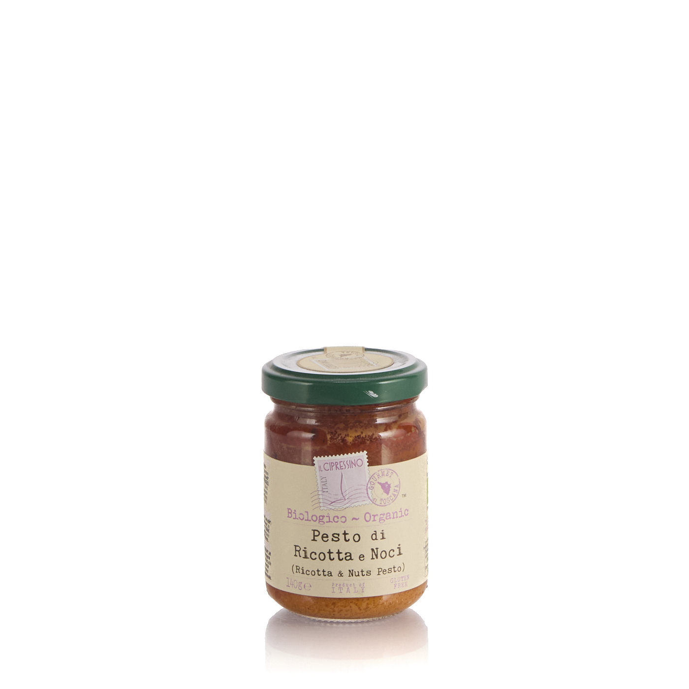 Pesto di ricotta e noci biologico, IlCipressino. Una ricetta tradizionale che unisce il gusto delicato della ricotta vaccina al sapore ricco delle noci, enfatizzando l’utilizzo di ingredienti biologici.