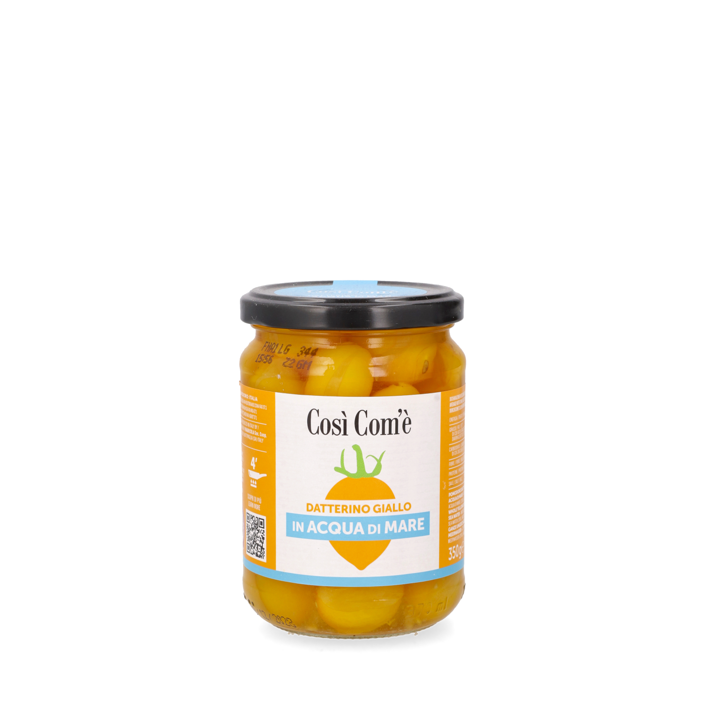 I datterini gialli in acqua di mare di Così Com'è sono una conserva dal sapore forte e deciso che riesce ad amalgamare la nota dolce dei pomodori datterini con la sapidità dell'acqua marina in un mix perfetto.