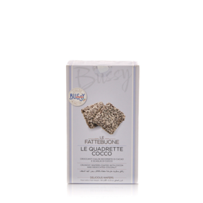 Quadrette cacao e cocco, Bussy. Deliziose cialde croccanti ricoperte di cacao e arricchite da scaglie di cocco, realizzate con cura seguendo la tradizione italiana.