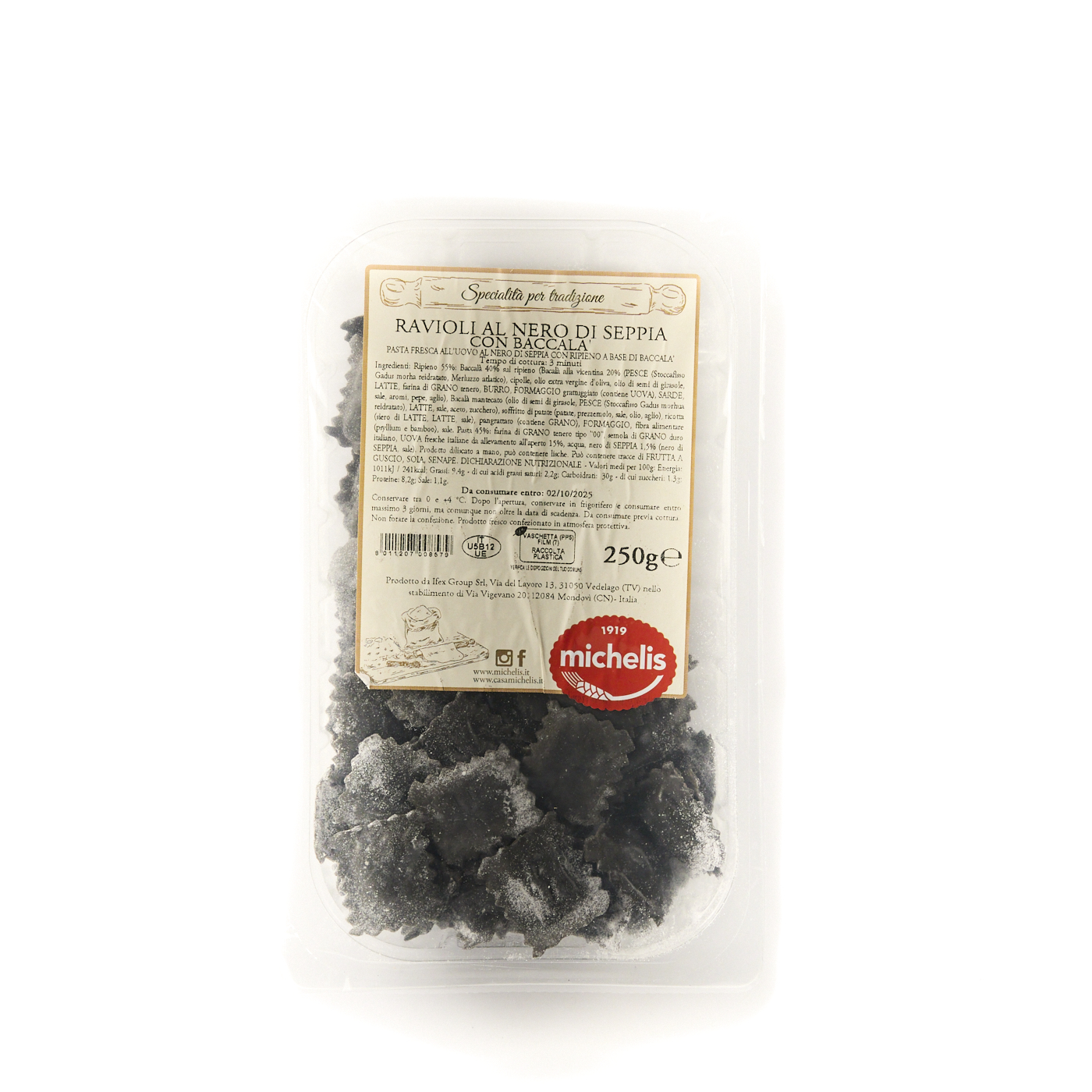 La pasta è preparata con farina di grano tenero tipo '00', semola di grano duro italiano e nero di seppia, mentre il ripieno racchiude baccalà mantecato e alla vicentina, ricotta e prezzemolo. Ogni raviolo è confezionato con attenzione per preservare la freschezza e il sapore.