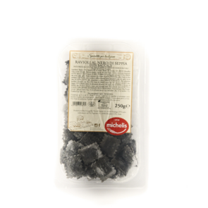 Ravioli al nero di seppia con baccalà, Michelis. Una specialità che combina il gusto deciso del baccalà con la delicatezza della pasta fresca al nero di seppia, per un’esperienza culinaria unica.