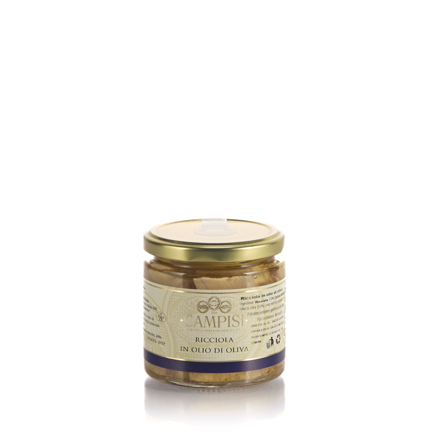 Ricciola in olio di oliva, Campisi. Una preparazione di alta qualità che celebra la tradizione siciliana, confezionata con cura in vasetto di vetro trasparente.