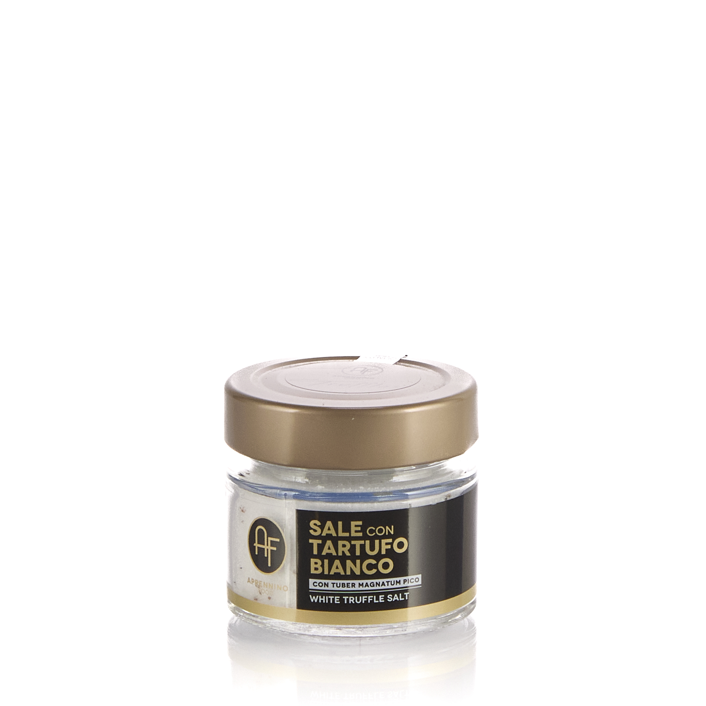 Sale al tartufo bianco e bianchetto, Appennino Food. Un insaporitore che combina il sale con l'aroma inconfondibile del tartufo bianco e bianchetto, ideale per aggiungere un tocco distintivo a ogni piatto.