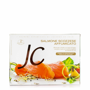 'Salmone Scozzese Affumicato di Jolanda de Colò: un prodotto di qualità eccezionale, ottenuto in seguito ad un''affumicatura a freddo con pregiata legna di faggio.