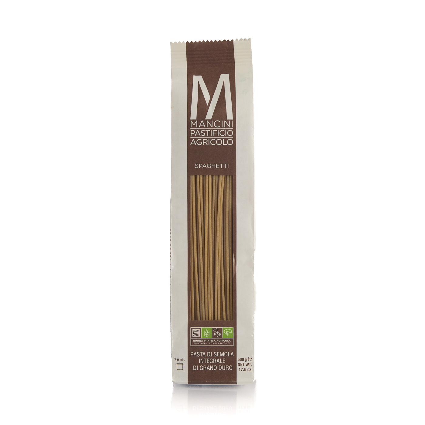 Spaghetti di semola integrale di grano duro, Mancini. Pasta dal gusto autentico, prodotta seguendo un metodo che valorizza la qualità della materia prima e il rispetto per la terra.
