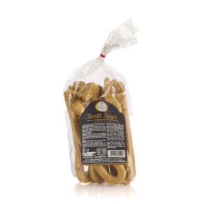 Taralli lunghi alla farina di grano tenero, Terre di Puglia. Un prodotto che celebra la tradizione pugliese, realizzato con cura e attenzione per garantire un sapore autentico.