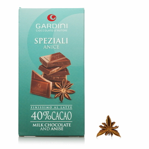 La tavoletta al latte 40% di 80 g, speziata all'anice di Gardini, ti regala nuove e deliziose sensazioni. L'incontro originale ed inconsueto tra il sapore forte ed aromatico dell'anice e quello dolce e delicato del cioccolato al latte ti portano in un mondo di sapori e profumi nuovi, unici ed inconfondibili, che ti delizieranno.