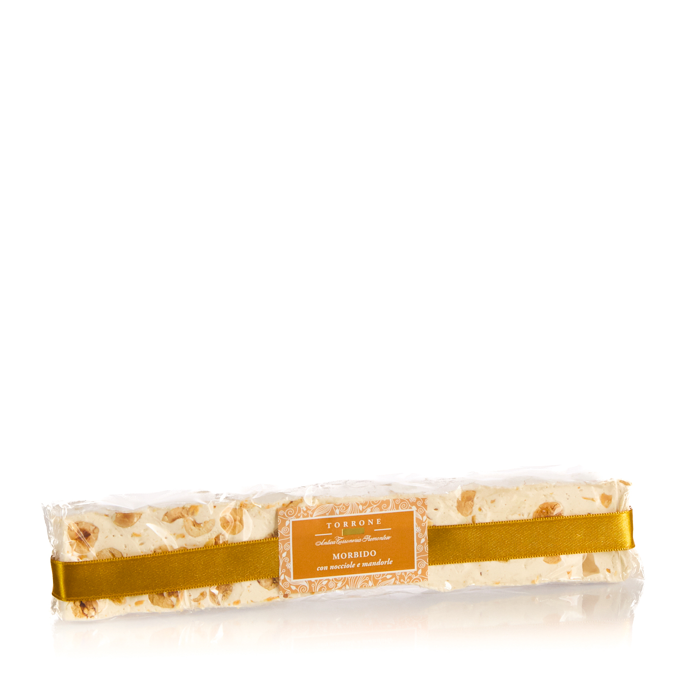 Torrone morbido con nocciola Piemonte IGP, Antica Torroneria. Un dolce tradizionale italiano che celebra l'eccellenza delle nocciole Piemonte IGP, avvolte in un impasto morbido e delicato.