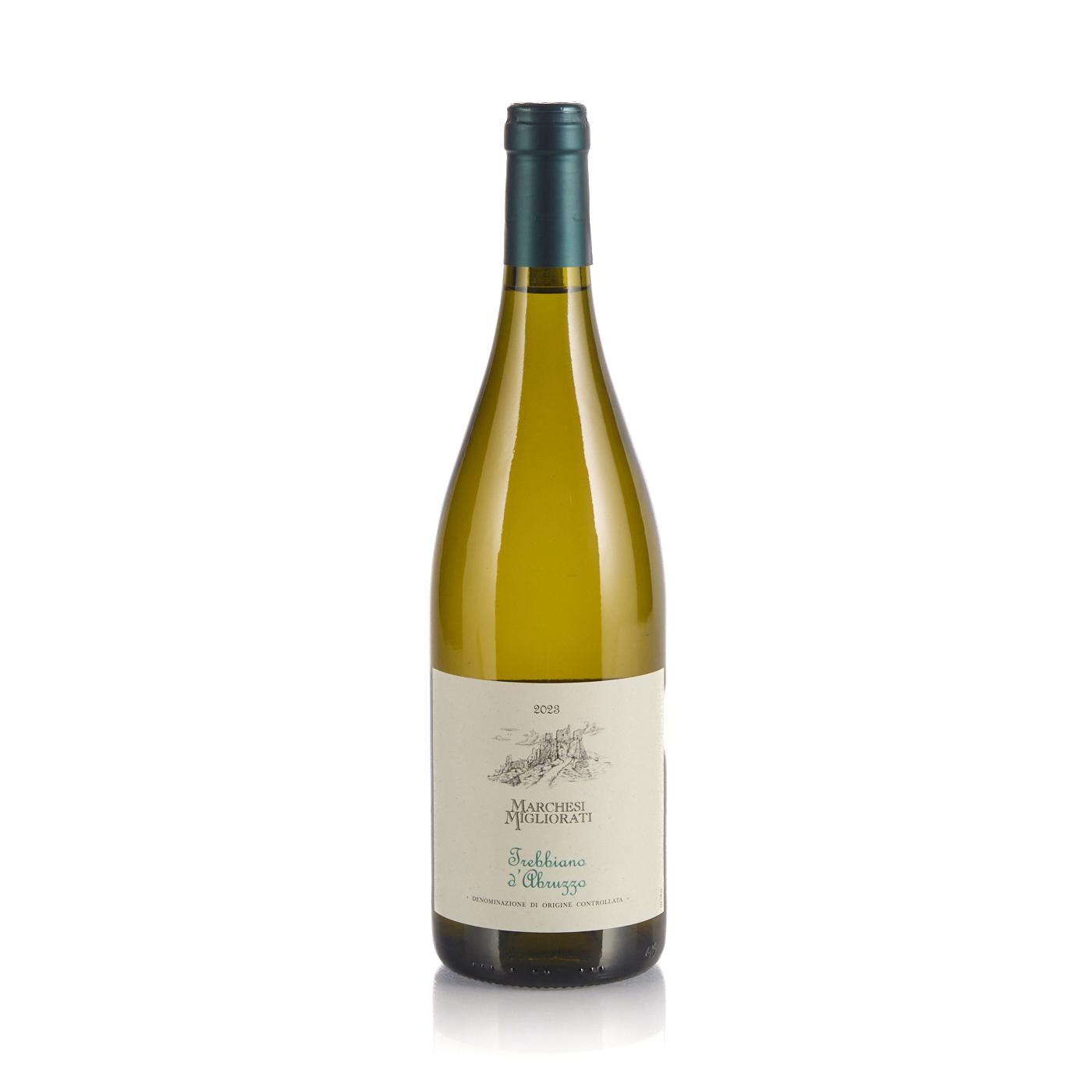 Trebbiano d’Abruzzo, Marchesi Migliorati. Questo vino bianco proviene dalle colline abruzzesi, tra il mare Adriatico e le vette del Gran Sasso, un territorio riconosciuto per la sua tradizione vinicola.