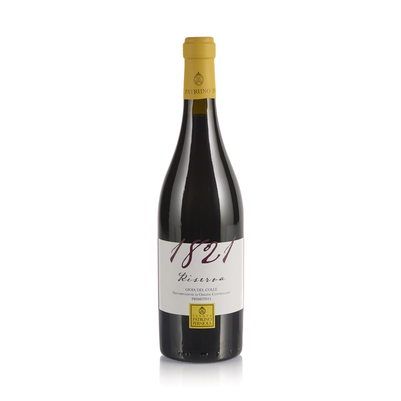 Vino Primitivo Riserva Gioia del Colle 1821, PatrunoPerniola. Un’etichetta raffinata che celebra l’essenza della tradizione vinicola pugliese e la cultura del territorio.